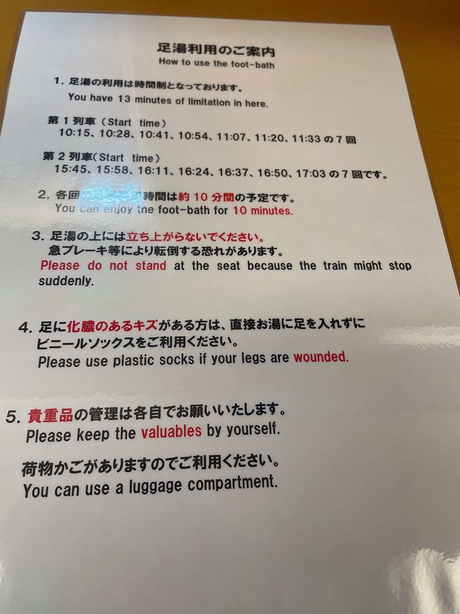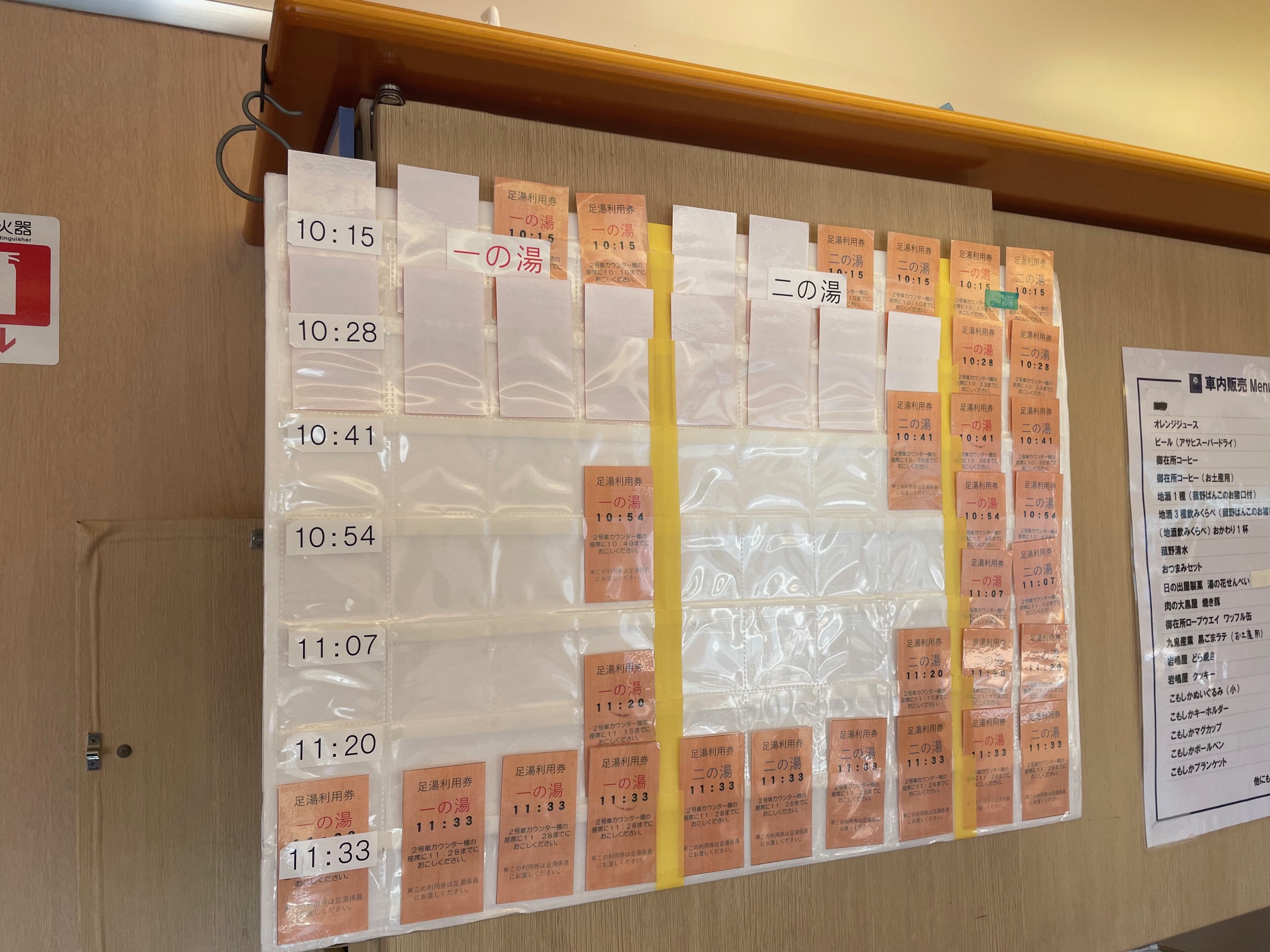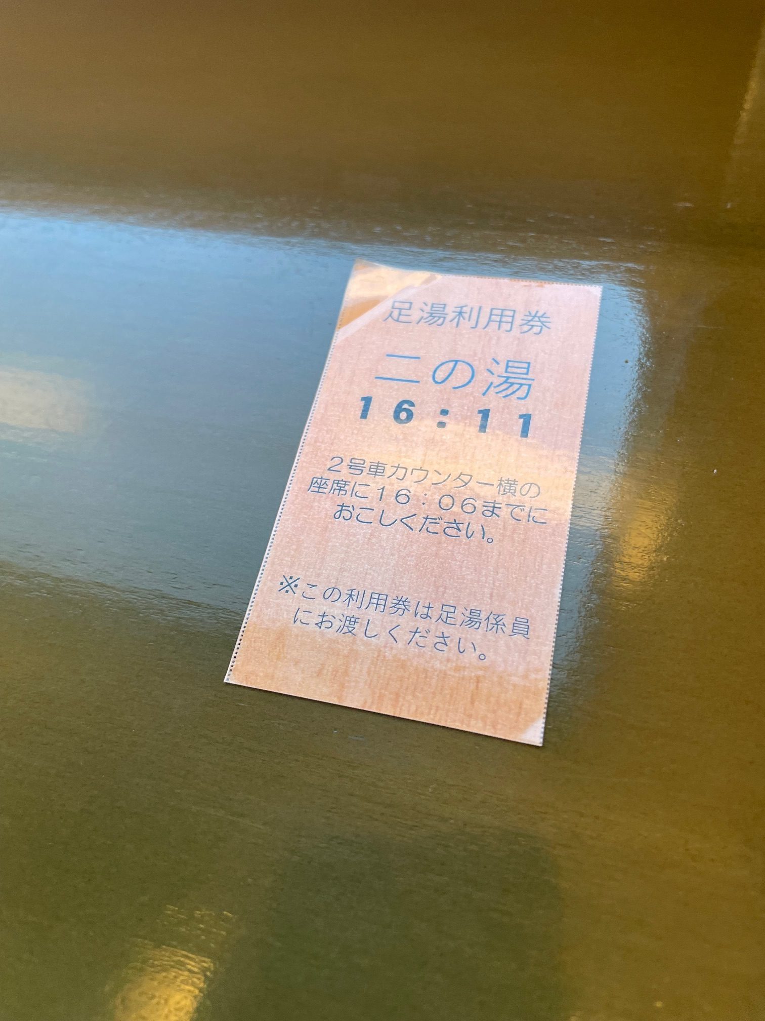 乗車時にもらったチケットを入浴時間の5分前になると呼び出しを受けるので、2号車へ。このチケットと@100-を出して、タオルを頂き、しばらく待ちます。