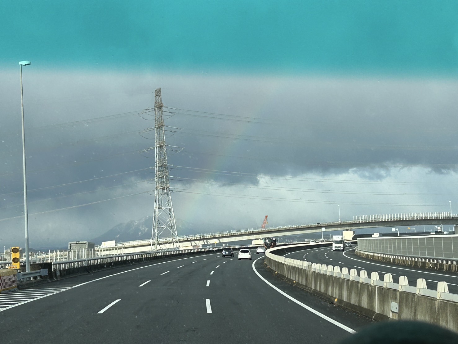 でもこんな天気のときこそのお楽しみ♪朝 車内から虹が見えました!